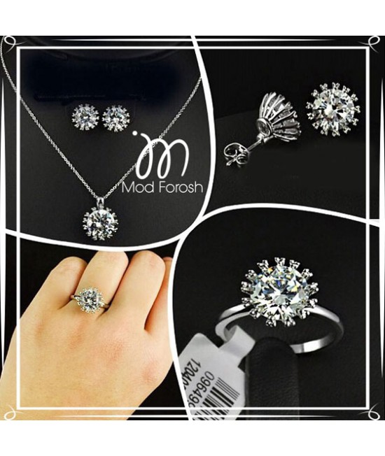 ست کامل گردنبند و گوشواره و انگشتر با روکش آب پلاتینیوم به همراه سنگ زیرکونیا با عیار 2.75 ct که در این ست تعبیه شده زیبایی چشمگیر آن را چند برابر میکند