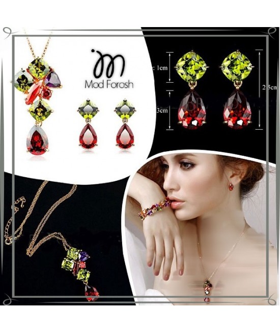ست گردنبند و گوشواره و دستبند با روکش آب طلا به همراه سنگهای زیرکونیای مکعبی شکل رنگی