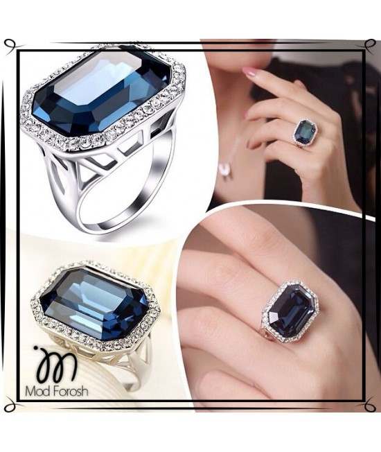انگشتر با روکش آب طلای سفید و کریستال اتریشی آبی رنگ سایز بزرگ. مدل: 117 .....